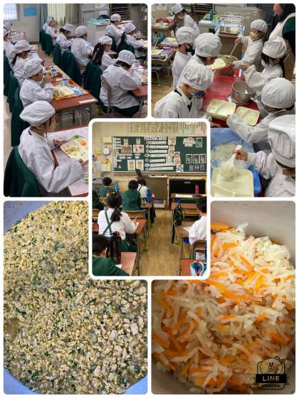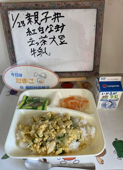 今日は、子どもたちに人気の親子丼でした。それと、紅白なますの甘酢がさっぱりとした味で低学年の子どもたちもしっかりと食べていました。