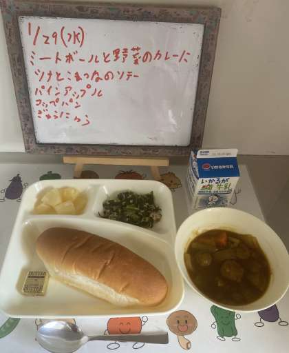 今日の給食では、「ミートソースのカレー煮」に使っています。