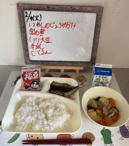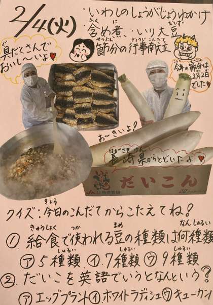 今日は、節分の行事献立でした。節分の日には、病気や悪い出来事を追い払うため、「鬼は外、福は内」といって豆まきをしたり、年の数だけいり大豆を食べたりする風習があり1年の無病息災を願う気持ちがこめられています。
