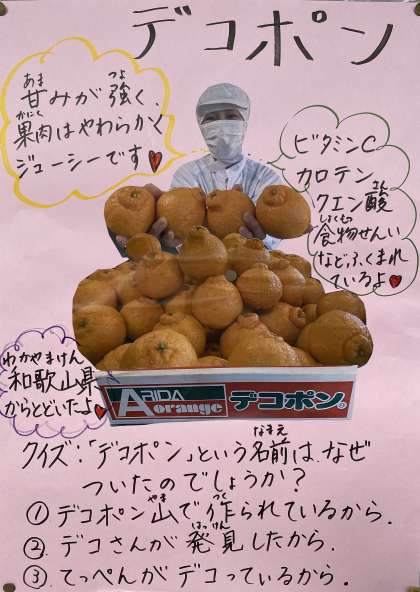 今日の「鶏肉とほうれんそうのシチュー」は、子どもたちに人気の献立です。さっぱりしたキャベツのサラダと、デザートのデコポン、「みんなおいしーい!」との声。教室中いい香りに包まれていました。