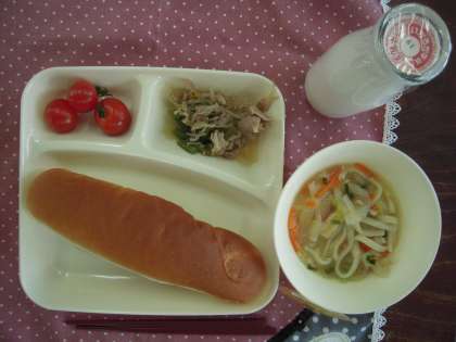 今日のこんだて:五目うどん、豚肉と野菜のいためもの、プチトマト、コッペパン、牛乳