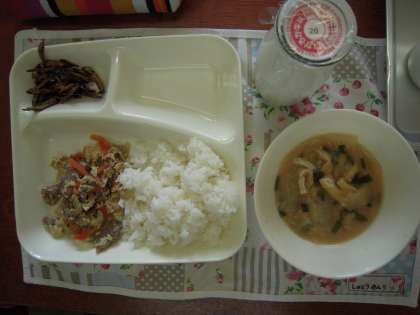 今日のこんだて:他人丼、みそ汁、ごまめ、牛乳