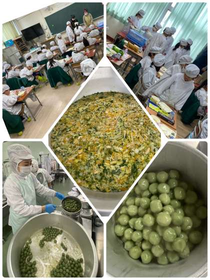 給食のよもぎだんごは、うるち米、もち米、よもぎから作られています。