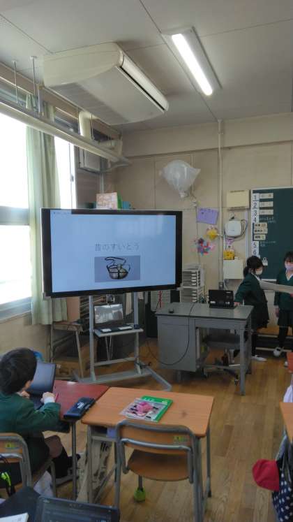 国語の学習です。すいとうの移りかわりを調べて発表しています!