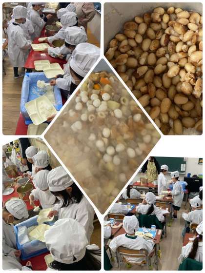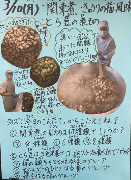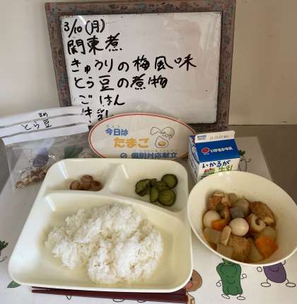 今日は、子どもたちや教職員にも大人気の「関東煮」献立でした。さっぱりとしたきゅうりの梅風味と、やさしい甘さのとら豆の煮ものがごはんが進む献立でした。ごちそうさまでした。