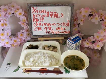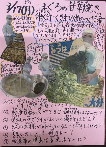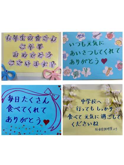6年間、給食をしっかりと食べてくれてありがとう!!中学校へ行ってもしっかり食べてね。そして大きくな〜れ❤