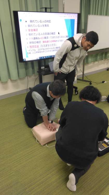 教職員の救命講習です。命をつなぐための処置を確認します。全員が実技を行うことでいざというときに備えます。