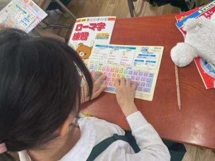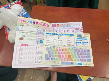 ローマ字学習のワークブックを配ってもらい、早速中身を見ていました。