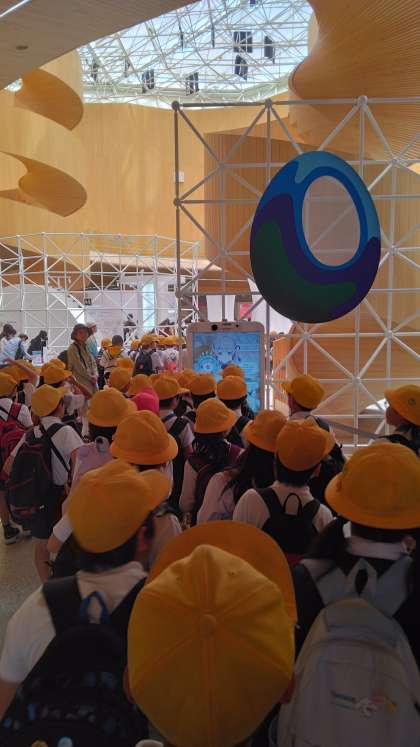 ヘルスケアパビリオンへ。ips細胞からできた心筋シートや人間洗濯機を見学します。