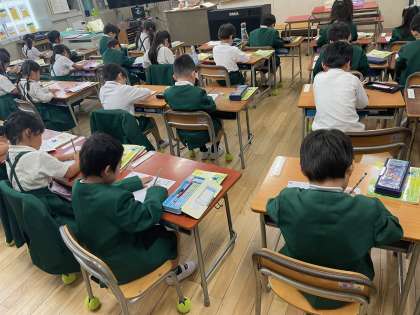 1年生は、ひらがなの学習に取り組んでいました。ひらがなの中でも書くのが難しい「あ」の字にチャレンジです!