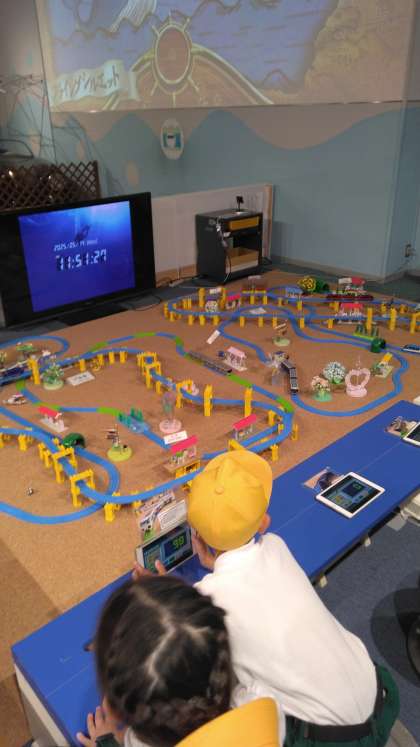 タブレットとプラレールが接続されています。どんな仕組みなのでしょう?これも、、、夢中になります!