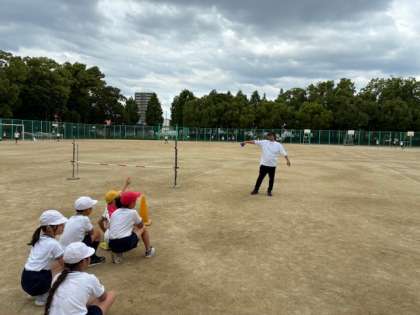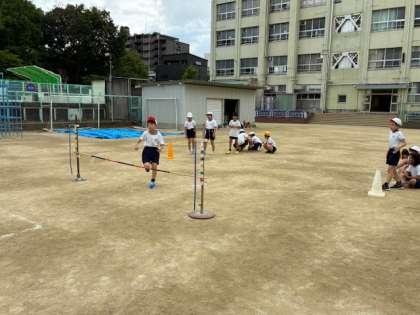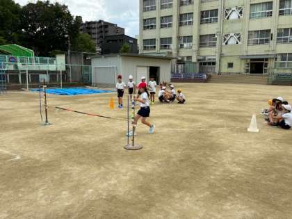 今日は高跳びの場を3つ用意し、それぞれバーの高さを変えながら、踏み切りの練習をしました。