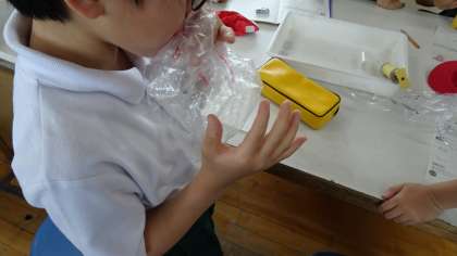 「ヒトの体は空気中から何を取り入れ、何をだしているのだろうか?」袋に吸う空気とはき出した息をためて、気体検知管や石灰水を使って実験をしました。さあどんな結果になったでしょうか!?