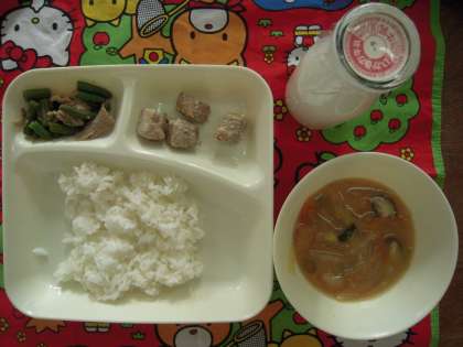 今日のこんだて:まぐろのしょうゆマヨネーズ焼き、みそ汁、三度豆のいためもの、ごはん、牛乳