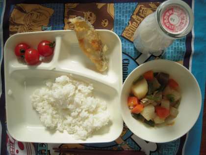 今日のこんだて:まだらのからあげ、じゃがいもと野菜の煮もの、プチトマト、ごはん、牛乳