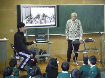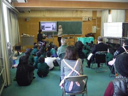 2時間目は多目的室で、昔のお話を聞きました。戦時中のお話や鶴見区の名前の由来、昔のみどり校区の様子、鶴見緑地のあたりは昔は湿地帯でレンコン畑だった等、いろんなお話を聞きました。