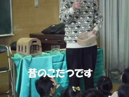 また、昔のこたつや、トンボをつかまえる道具も紹介していただきました。お話の後にドングリのコマのお土産もいただきました。