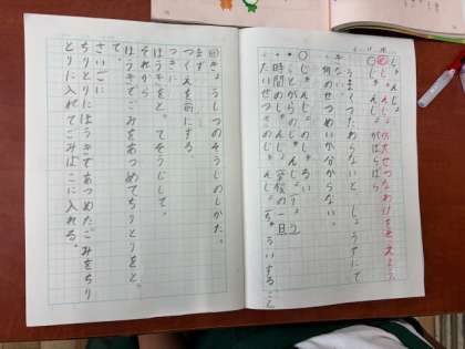 その後、正しく順序立てて説明できるように、教室の掃除の順序をノートに書いていきました。