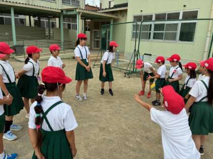 今日のゲームは、「ボール回しゲーム」です。たてわり班で輪になり、ボールを順番に回していきます。音楽が止まったときにボールを持っていた人がアウト!というルールです。