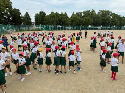 梅雨入りをして雨続きでしたが、今日は雨もやみ、運動場に出て児童集会を行いました。