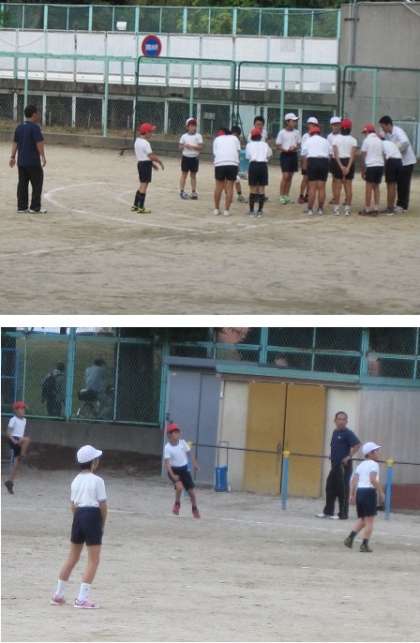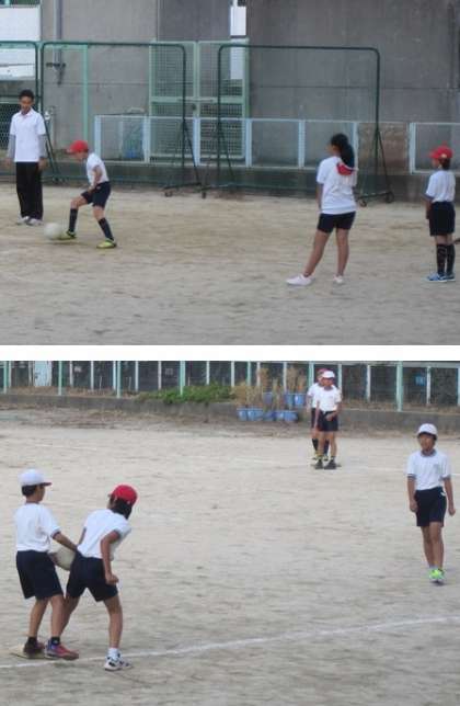 講堂で球技Aクラブがドッヂボールを、運動場では球技Bがキックベースボールをしていました。