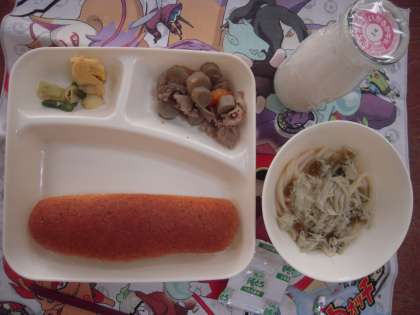 今日のこんだて:豚肉とごぼうの煮もの、なにわうどん、キャベツと三度豆のごまあえ、ライ麦パン、牛乳
