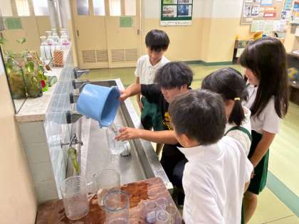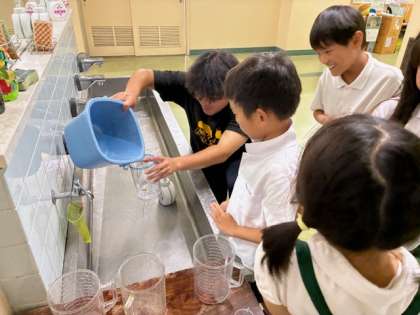 今日は、1リットルの水の量を体感できるように、バケツに水を入れ、それを測ってみるという体験的な学習を行いました。