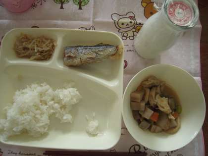 今日のこんだて:さんまのみぞれかけ、鶏肉と野菜の煮もの、もやしのあえもの、ごはん、牛乳