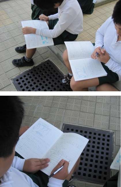 運動場の隅の土が盛り上がっているところで、水を流して実験していました。