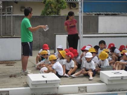 先生からお話(やごとりの約束)を聞いて、早速プールの中へ。