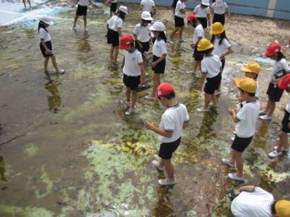 5時間目に水がほとんど残っていないプールでやごとりをしました。