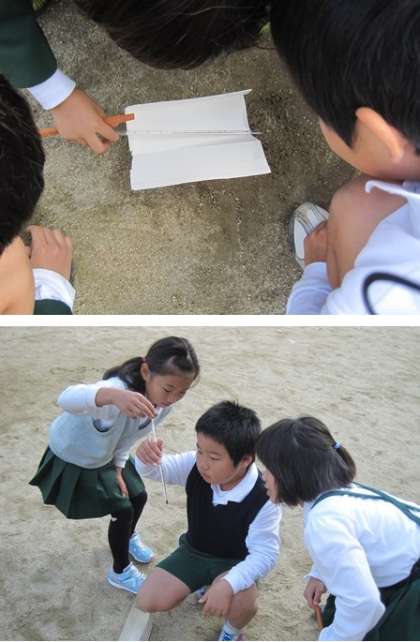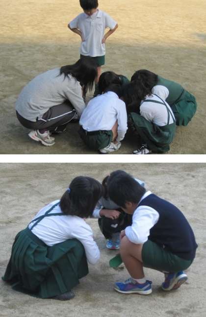 3年生が運動場で理科の勉強中でした。