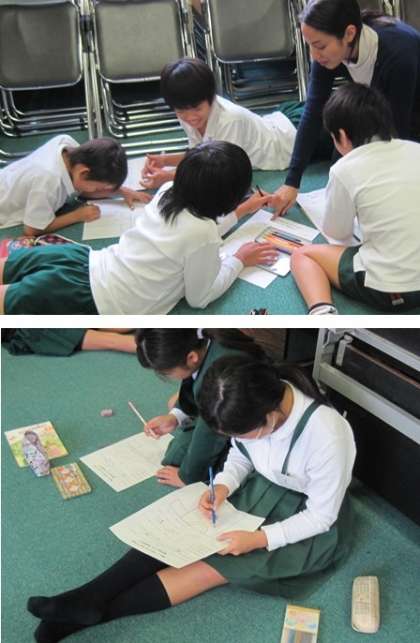 色や形、動物、果物の言い方を練習した後、Tシャツの絵をプリントに書きました。