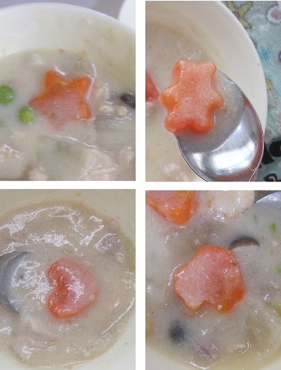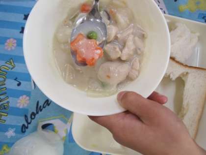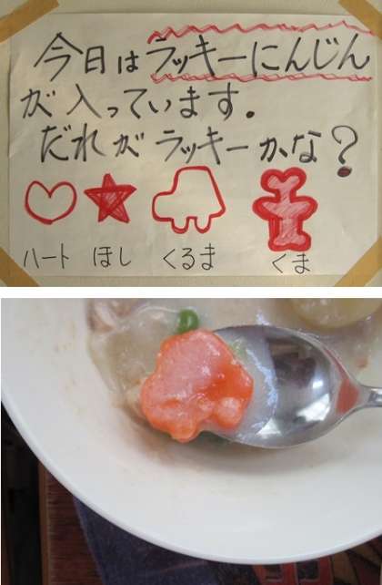 今日の給食のクリームシチューには、クマ・ハート・星・クルマの4種類のハッピーにんじんが入っていました。