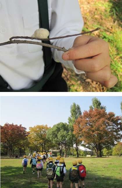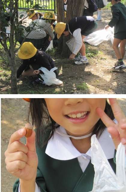 鶴見緑地では、いきいき地球館の裏の雑木林でドングリを拾ったり、落ち葉を集めたりしました。