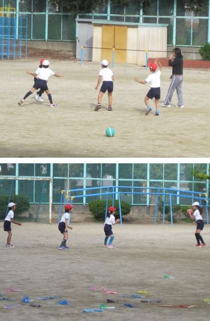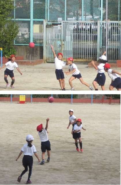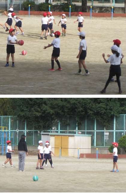 バスケットボールのように、2対2に分かれて、お互いにボールを奪い合うゲームのようなものをしていました。どのグループもボールを奪われまいと一生懸命パスをしていました。寒さに負けずとても元気に活動していました。