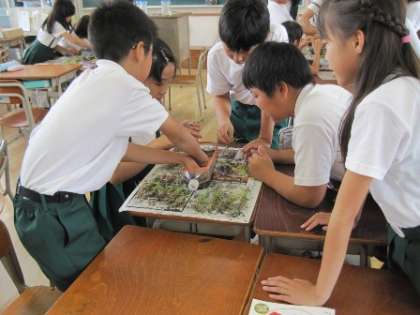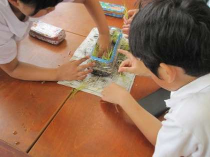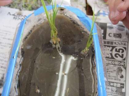 今年、5年生は社会&総合の学習で「バケツ稲」に挑戦する計画を立てています。種もみから発芽させた稲の葉が程よい長さに成長したので、田植えをしたのです。
