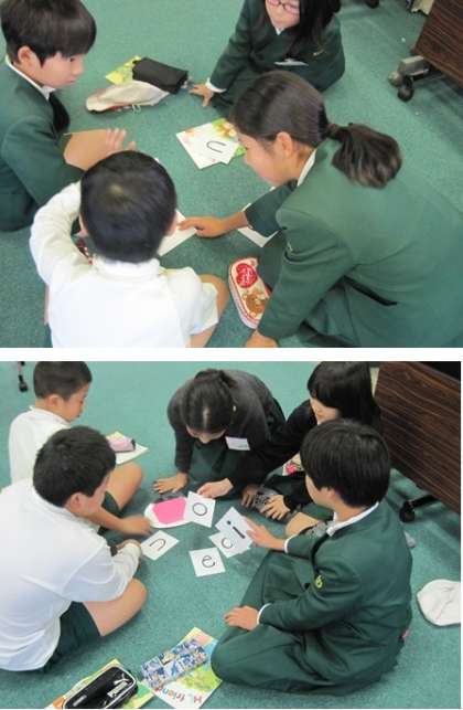今日は、マジェサ先生の発音を聞いて、どの文字が入っているかグループで相談し回答するというゲームをしていました。