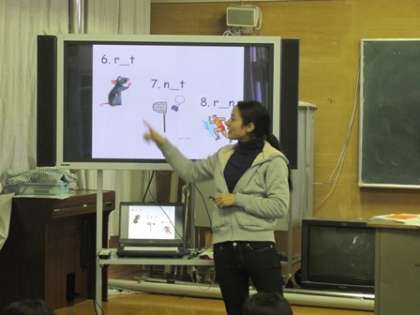 毎週水曜日には、C−NETのマジェサ先生が5、6年生と外国語活動の勉強をしています。これは、5年生1組の人と一緒に勉強しているところです。