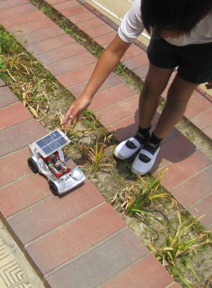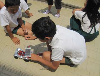 太陽の位置を確かめて、光電池の傾きを工夫しながら、なんとか上手に走らせようと、がんばっていました。