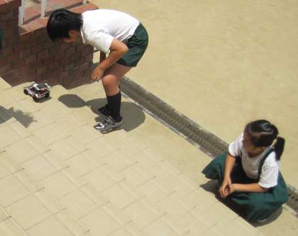 4年生が理科の学習で作った、太陽光電池でモーターを回す車を走らせていました。