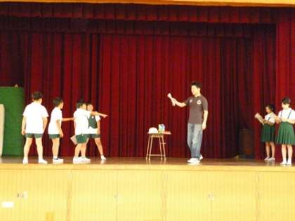 保健委員会の児童は、先日からいろいろ作った小道具を使って講堂で6日(木)の歯みがき集会のリハーサルをしていました。