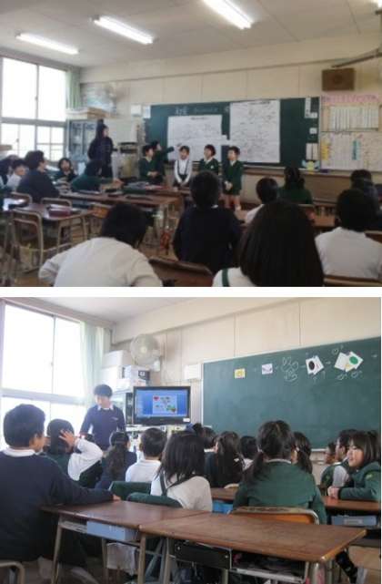 3年生は、1組、社会科の発表風景と2組、外国語活動の様子です。