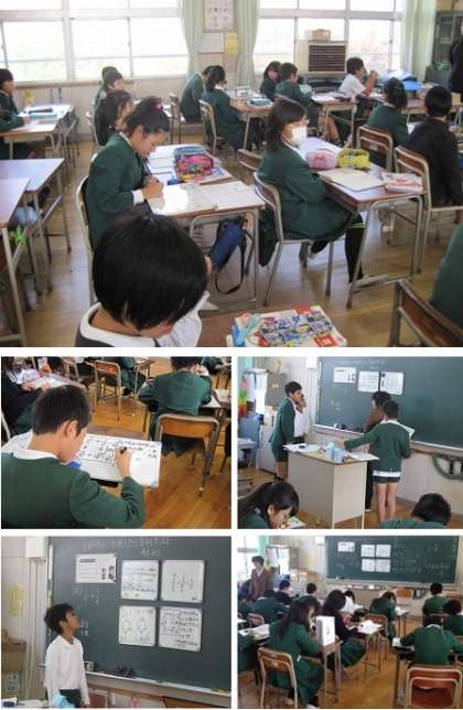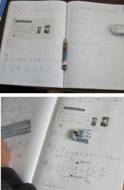分母の違う分数どうしで、どうやればひき算ができるのか、いろいろ意見を出し合っていました。