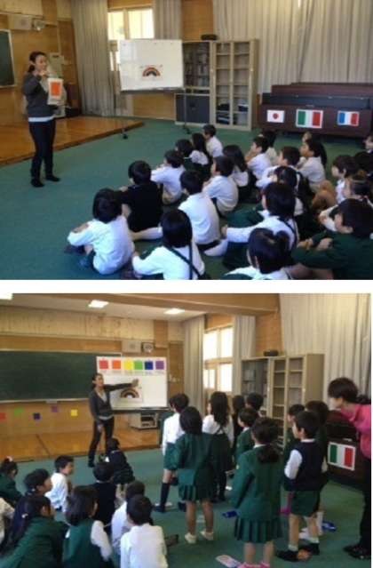 授業を終えて外へ出てきた1年生は、「とても楽しかった!」という感想を口々に言っていました。中には、色鉛筆のケースの「青色」を指さして「ブルーだよ!」と教えてくれる子もいました。