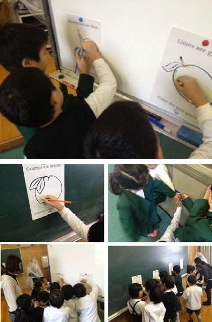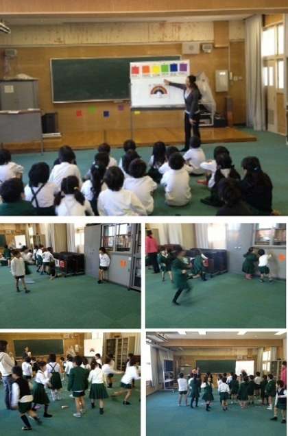 多目的室に、1クラスずつ入って、色のことを中心に英語を習いました。