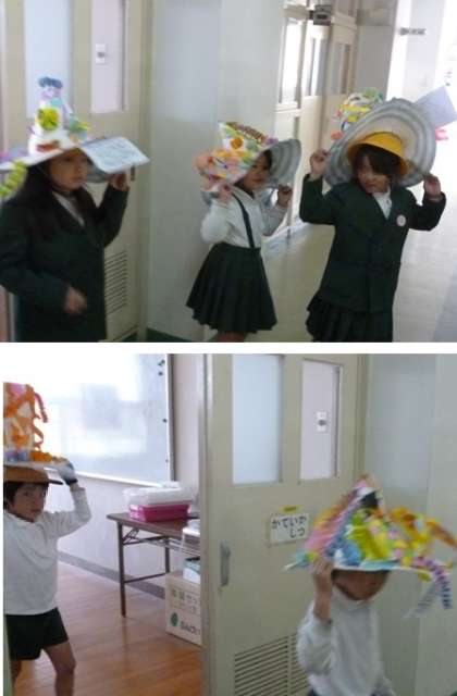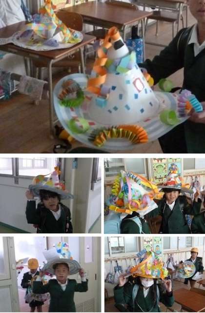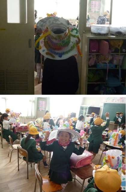 2年生は、作品展のために制作していた帽子を運ぶとき、ほとんどの児童が帽子をかぶって歩いていました。まるでファッションショーのようなかわいい行進でした。