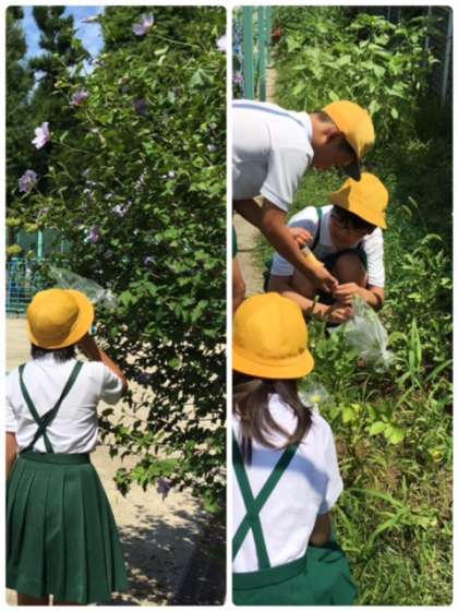 7月6日、青空の下じりじりと照りつく太陽にも負けない6年2組。元気に理科の「植物のつくりとはたらき」の単元で「植物と空気」の関係について実験を行いました。息を入れた直後と1時間後の空気の成分を気体検知管を使い、酸素と二酸化炭素の割合を調べました。結果は、子どもたちに聞いてみてくださいね。発展的な内容として、光合成についても学習し、ちょっと中学校を意識する授業でした。
