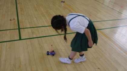 実験がはじまると、風の力で動く車をどのようにすると遠くまで動かすことができるかを、うちわや送風機を使って何度も確かめながら考えていました。