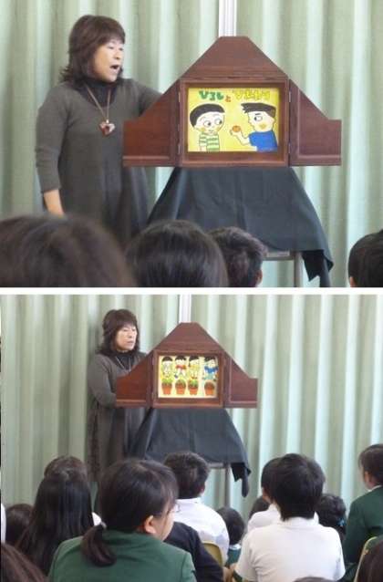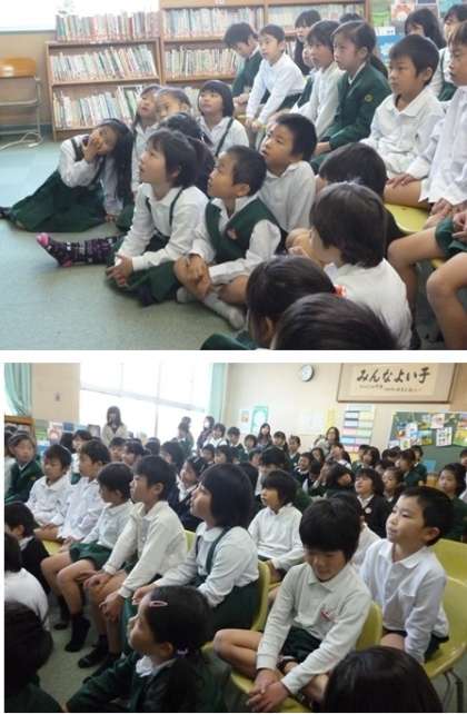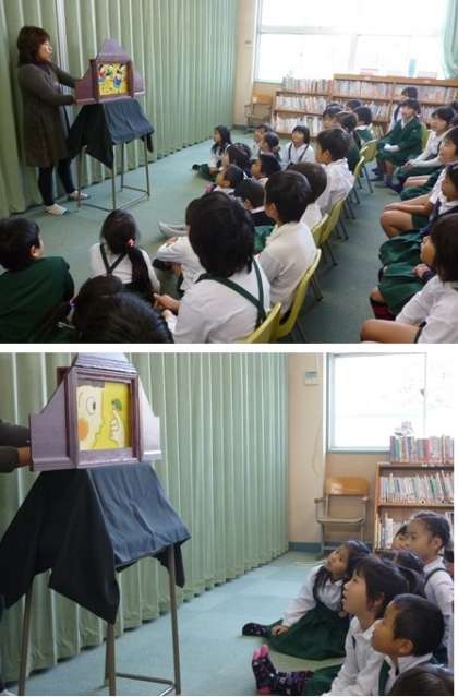 図書ボランティアさんのお話の読み聞かせが15分休みに図書室でありました。
